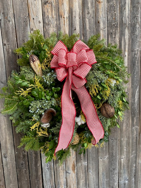 Artist Sammy created a beautifully textured wreath with natural pods to accent.