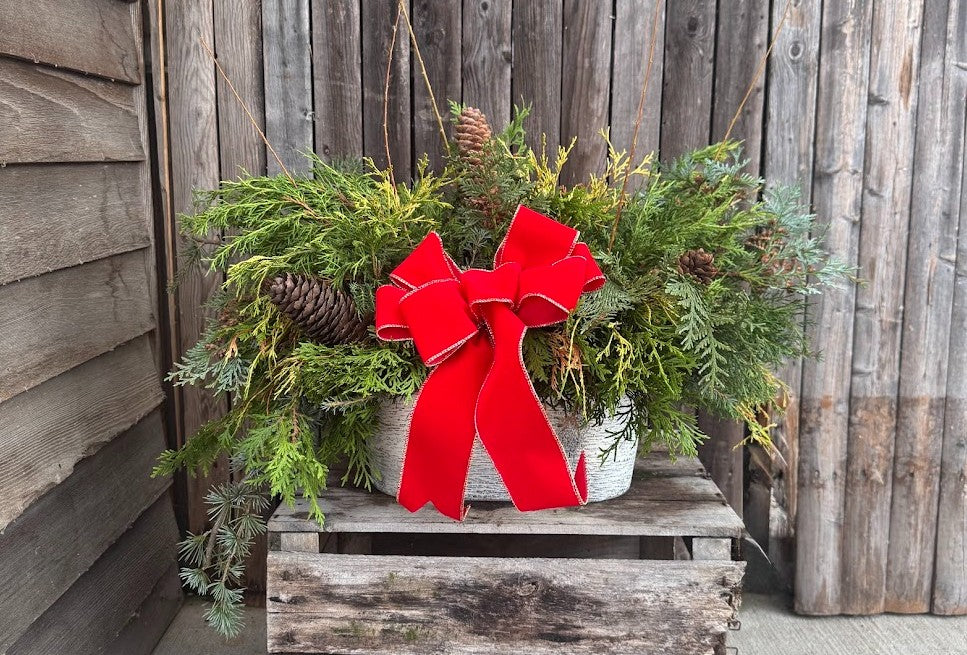Each pot features a lush mix of evergreen branches, seasonal accents like red berries, pinecones, and twigs, and a decorative bow to complete the look. Handcrafted with fresh, long-lasting greens, this arrangement adds a touch of natural elegance to your porch, patio, or entryway. Perfect for welcoming guests or gifting to someone special, our Holiday Patio Pot is the effortless way to celebrate the season in style.