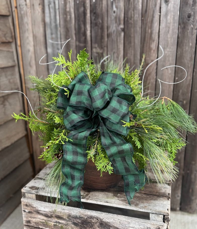 Each pot features a lush mix of evergreen branches, seasonal accents like red berries, pinecones, and twigs, and a decorative bow to complete the look. Handcrafted with fresh, long-lasting greens, this arrangement adds a touch of natural elegance to your porch, patio, or entryway. Perfect for welcoming guests or gifting to someone special, our Holiday Patio Pot is the effortless way to celebrate the season in style.